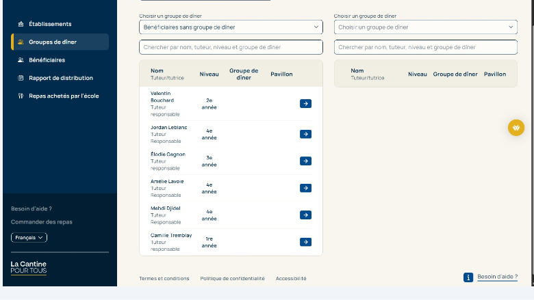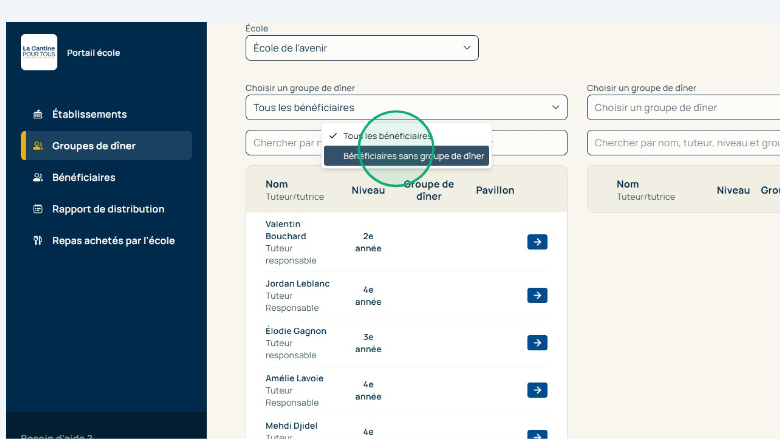 La liste affiche désormais les bénéficiaires sans groupe de dîner pour l'école sélectionnée.